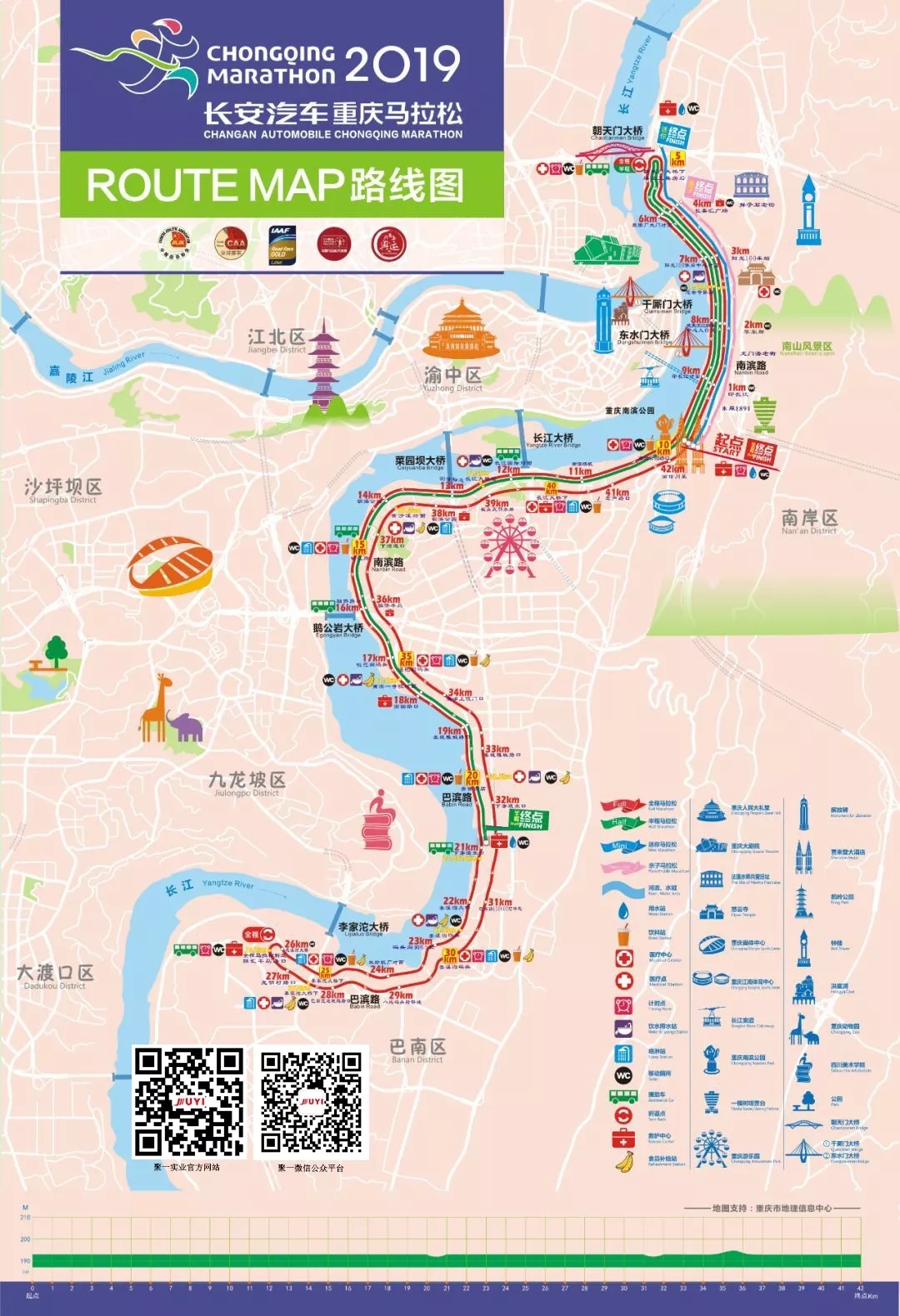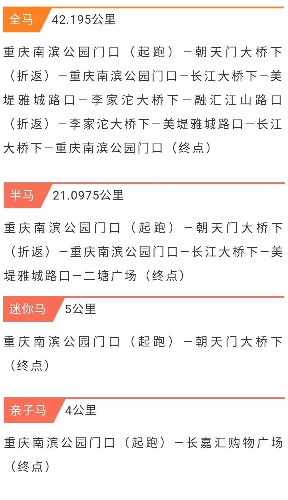 本次重馬依然由中國田徑協(xié)會和重慶市體育局共同主辦,共設(shè)置了全程馬拉松、半程馬拉松、迷你馬拉松及親子馬拉松四個項目。和往年一樣,今年重馬半程和迷你馬拉松的起點都為重慶南濱公園,終點分別為南濱公園、二塘廣場和朝天門大橋下;而親子跑的起點為南濱公園,終點為長嘉匯購物公園。